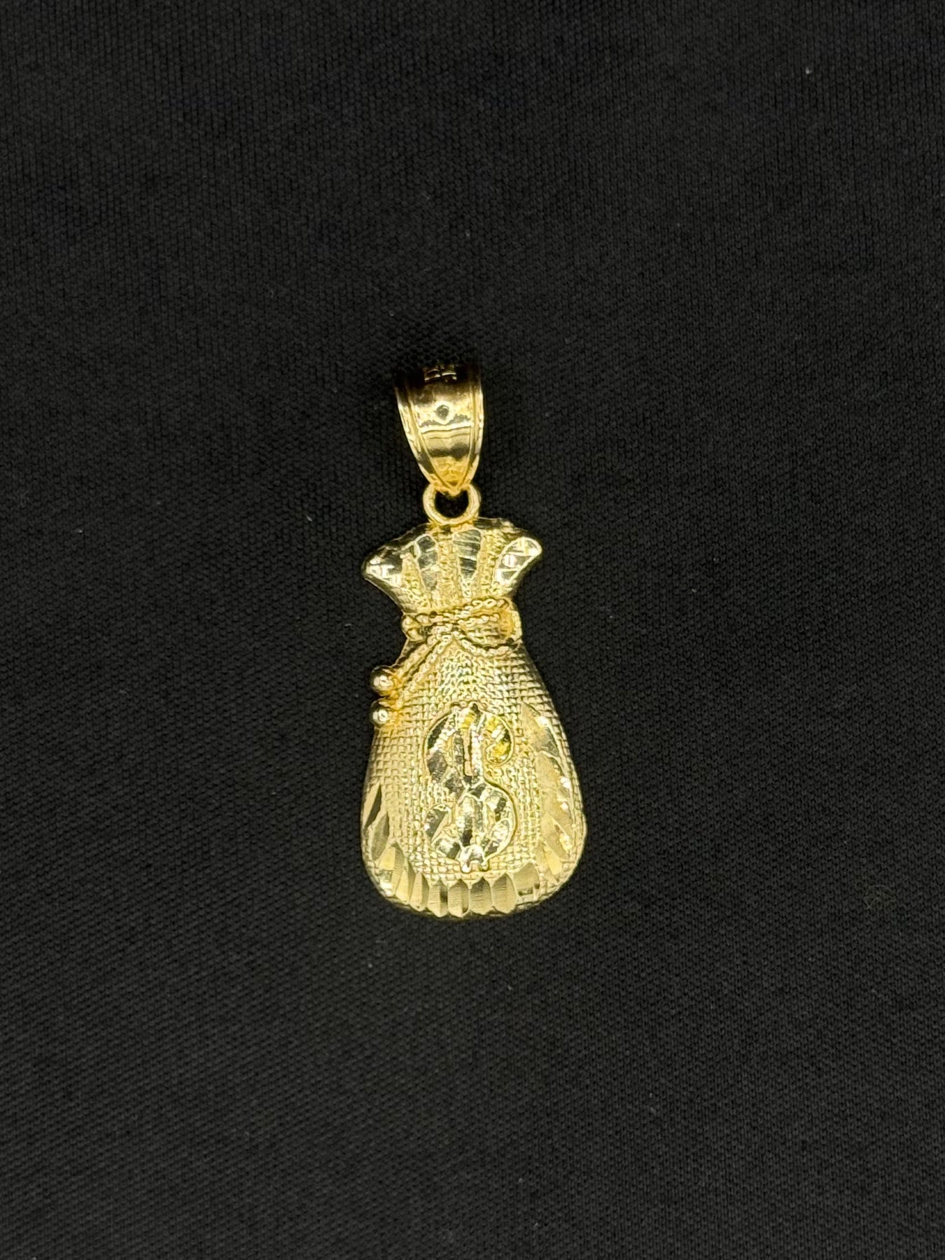 10K Yellow Gold dia cut Money bag pendant small and large sizes available. This Pendant Size is 1.40 and by 0.46 inch .