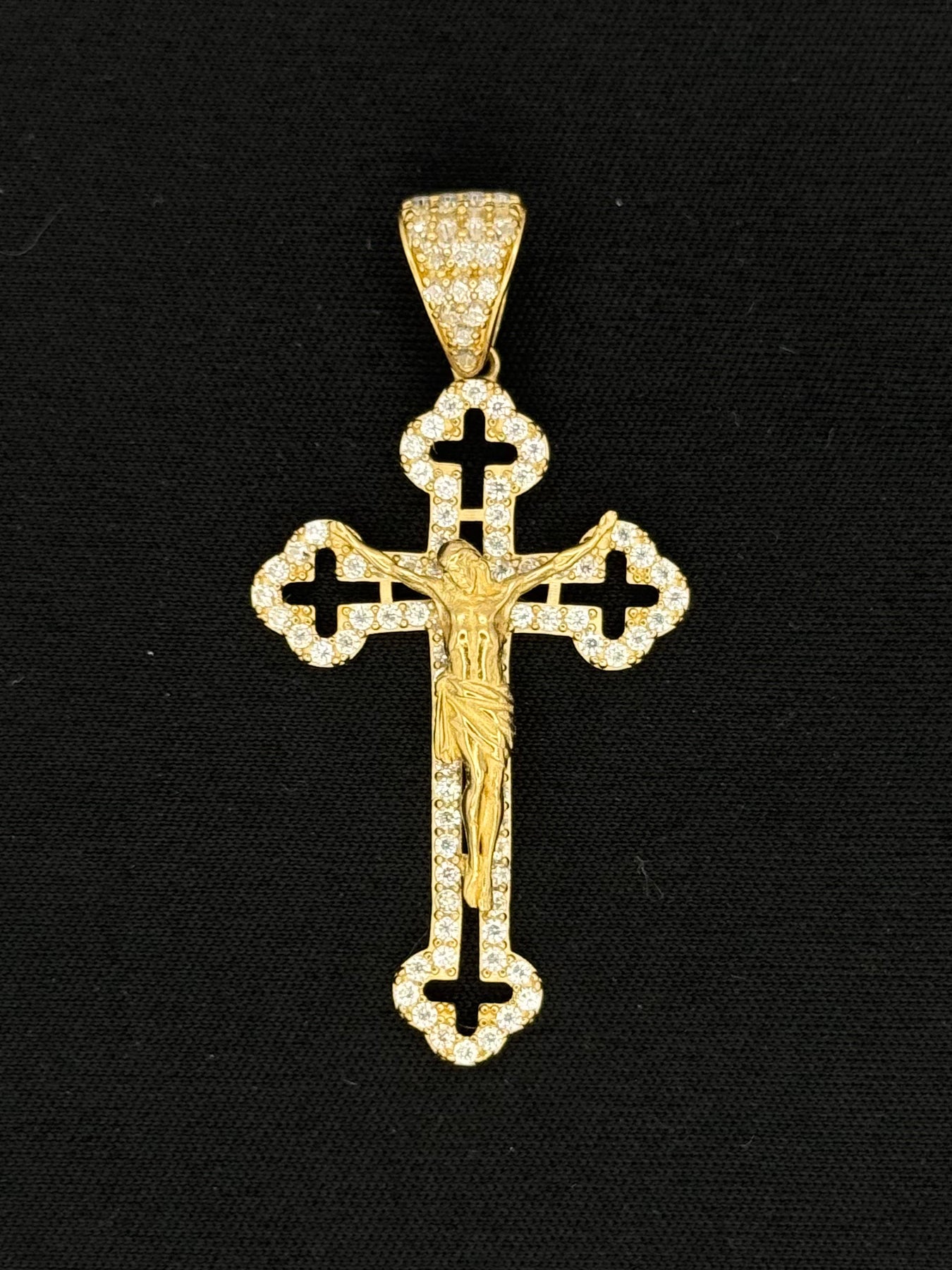 10K Yellow Gold Fancy CZ  3D Cross design pendant in small and large sizes available. This Pendant Size is 1.86 and by 0.95 inch .