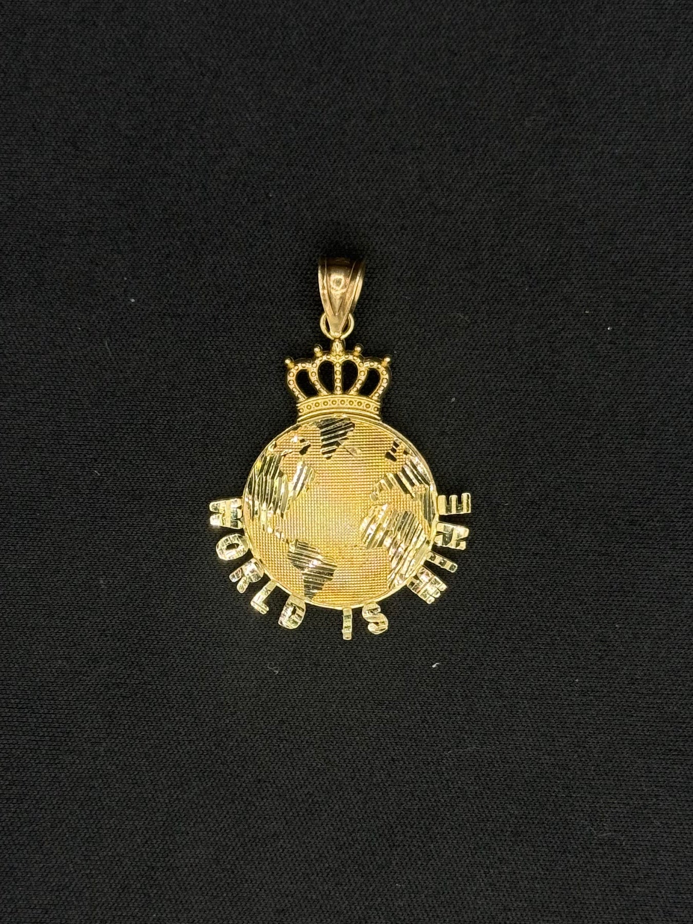10K Gold World is mine globe with a crown on top Pendant small and large sizes available. This Pendant Size is 1.50 by 0.98 inches.