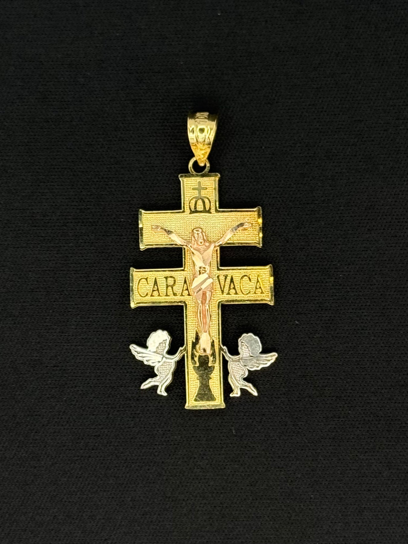 10K Tri Gold Caravaca with Jesus 3D design pendant in small and large sizes available. This Pendant Size is 1.46 and by 0.72 inch .