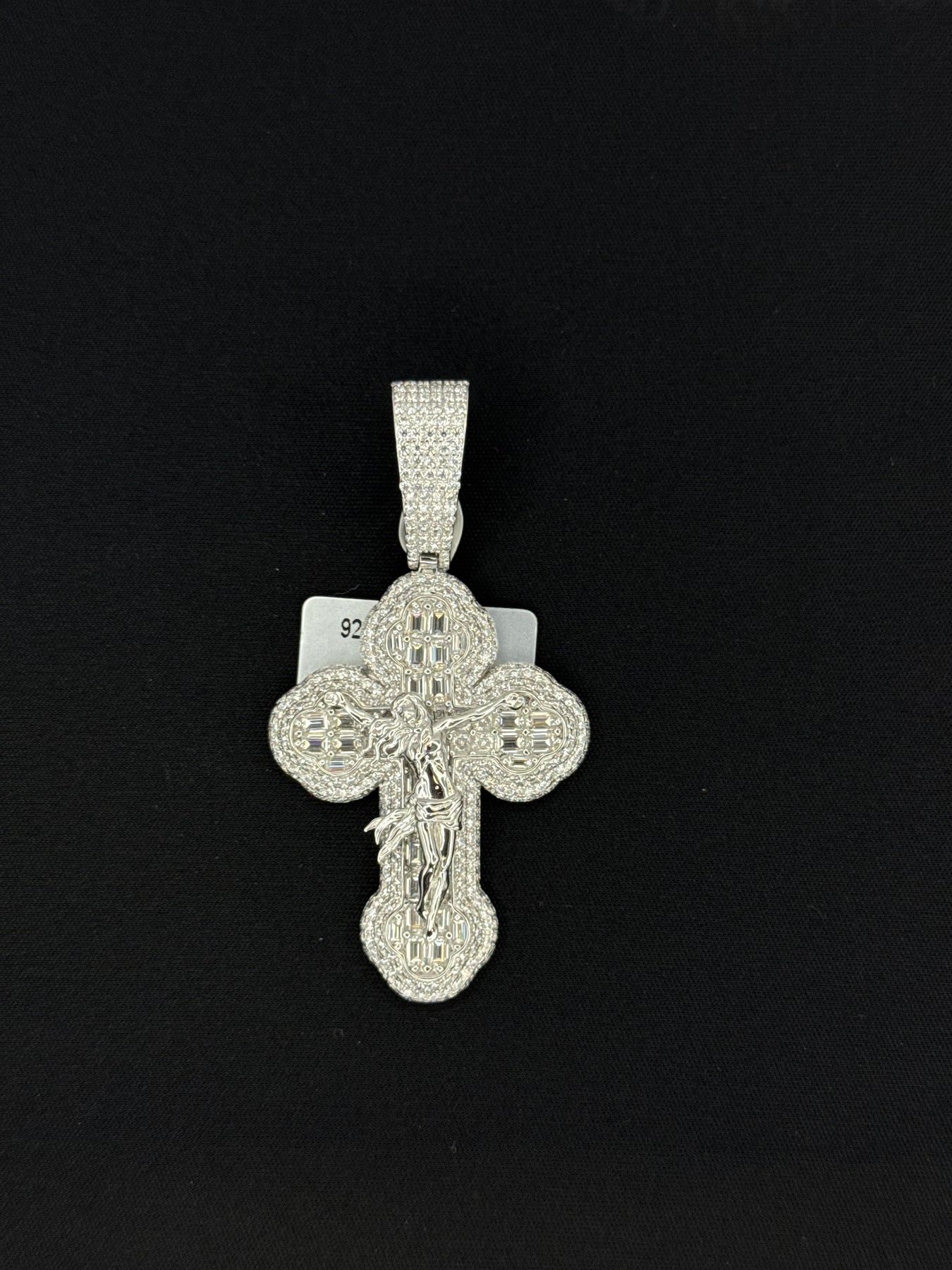 925 Silver Moissanite baguette Cross with Jesus on it Pendant. in small and large sizes available. This Pendant Size is 2.50 and by 1.33 inch .