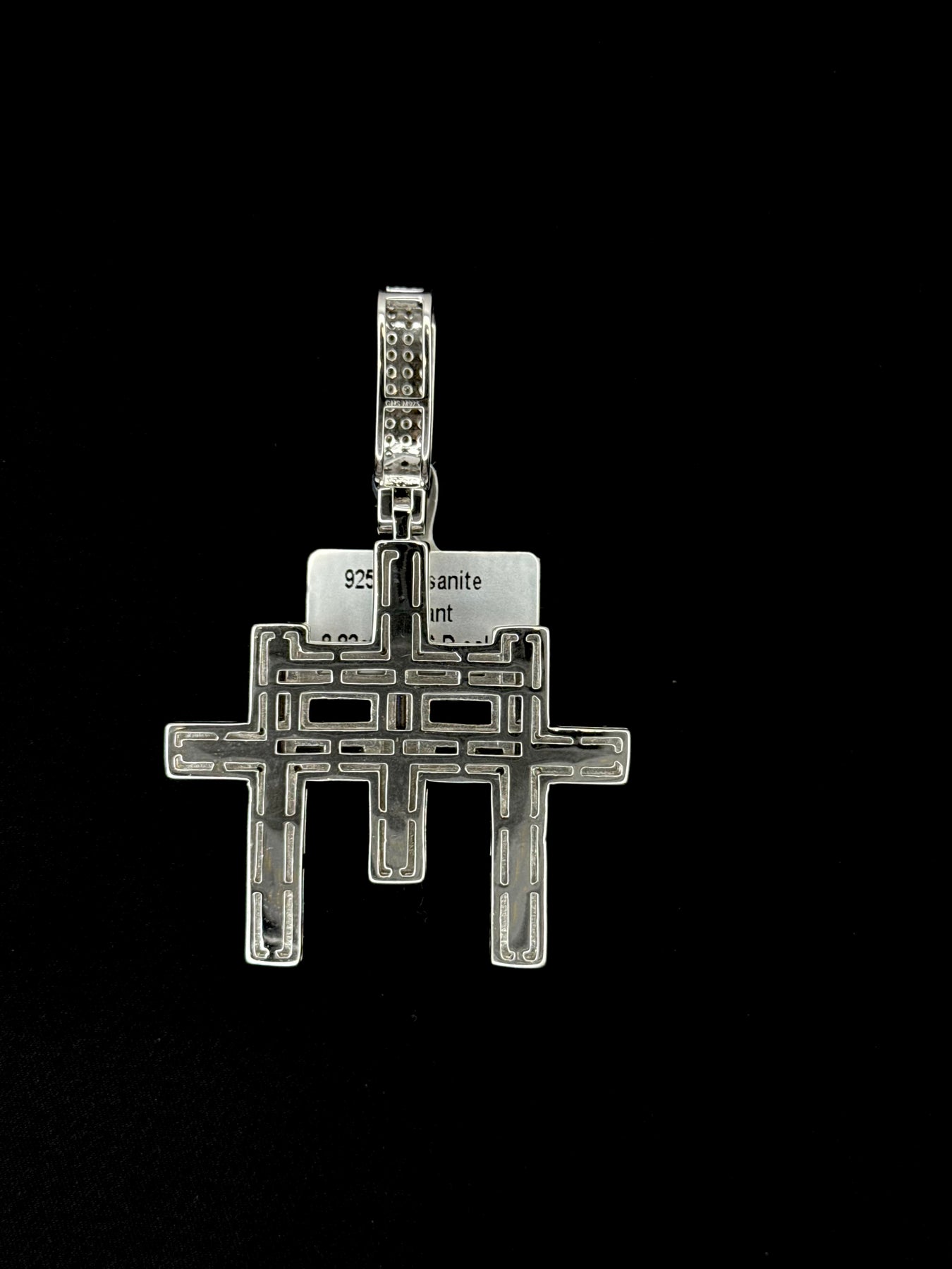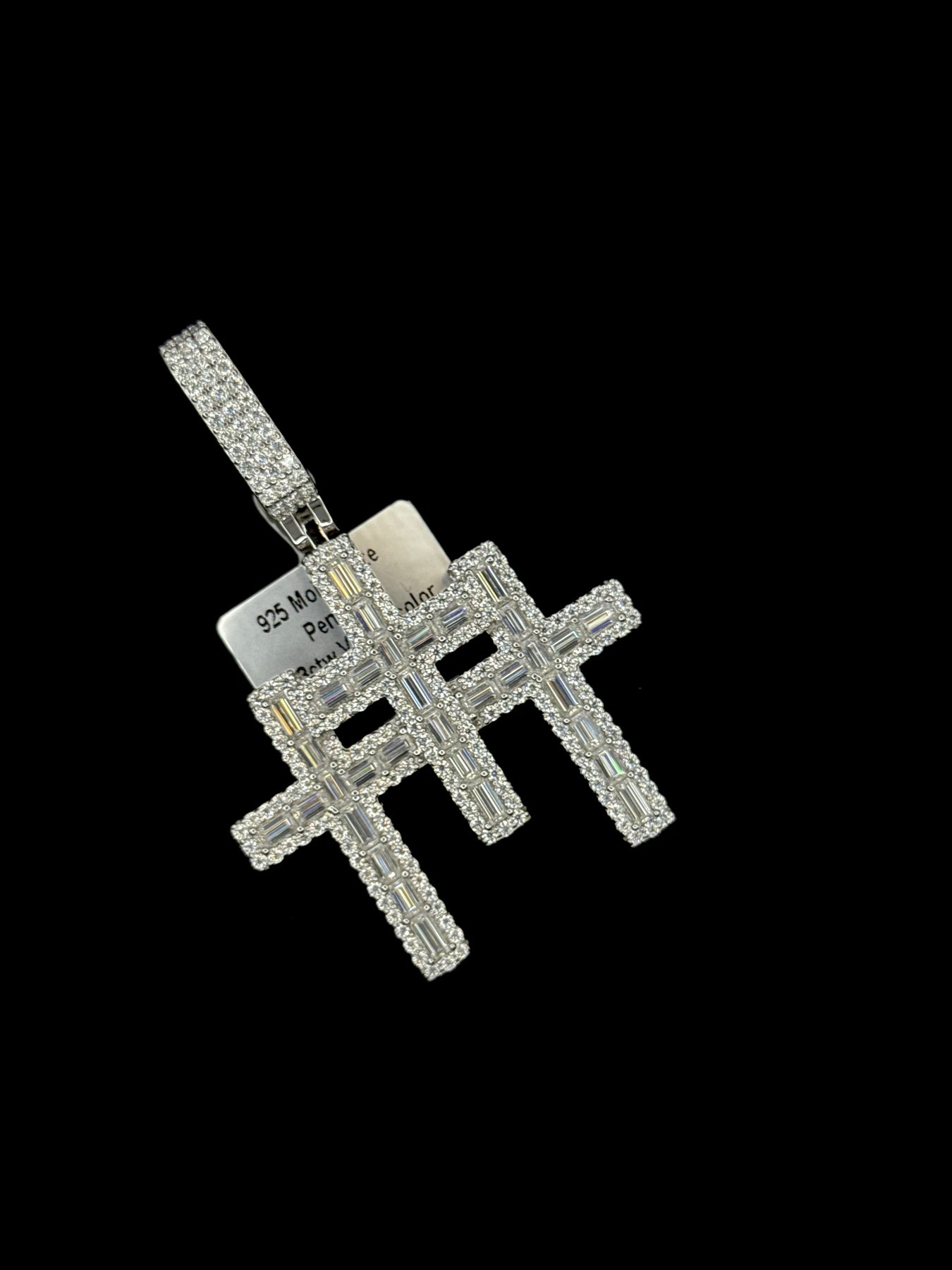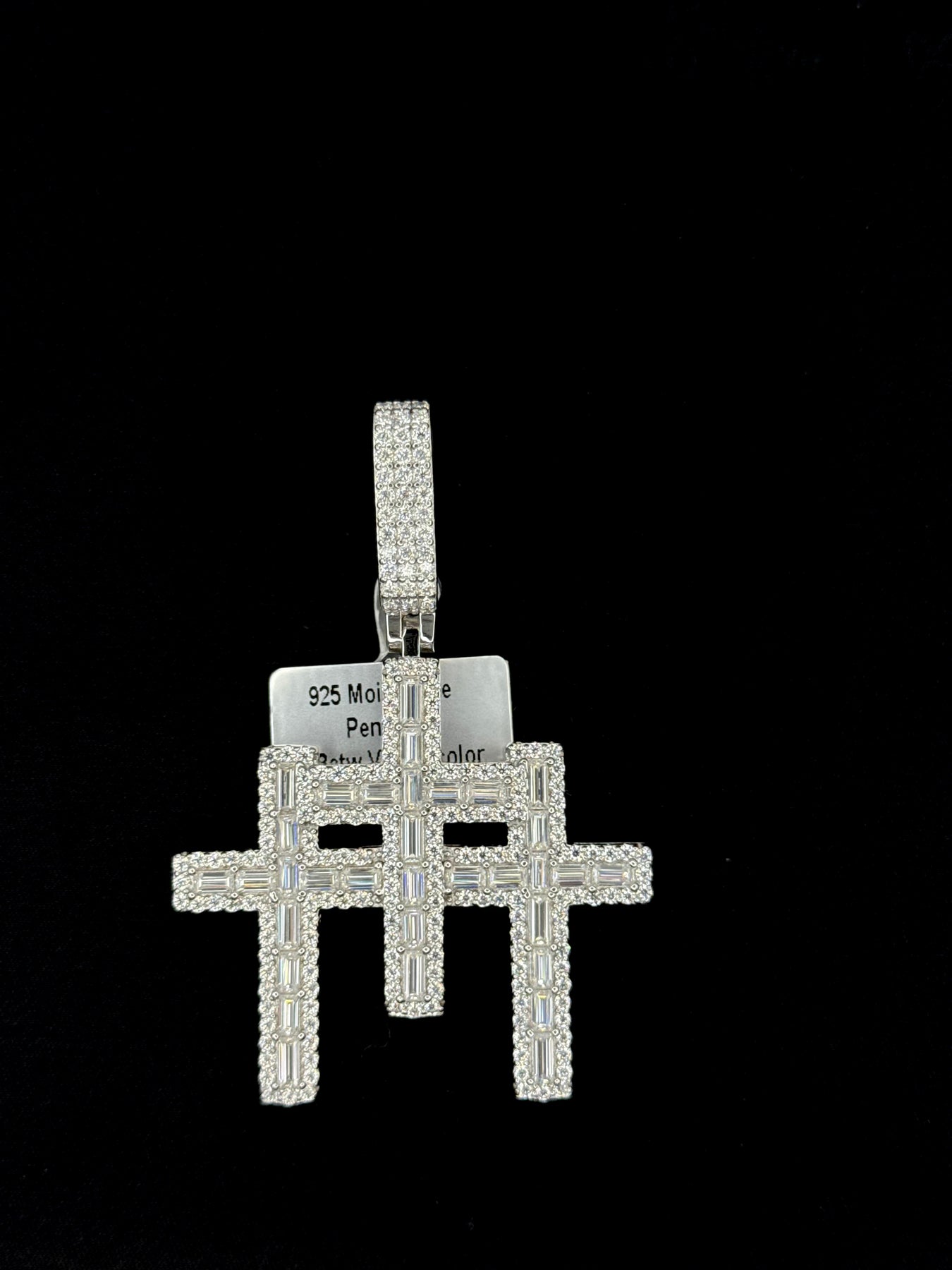 925 Silver Moissanite Baguette Triple Cross Pendant. in small and large sizes available. This Pendant Size is 2.80 and by 1.91 inch .