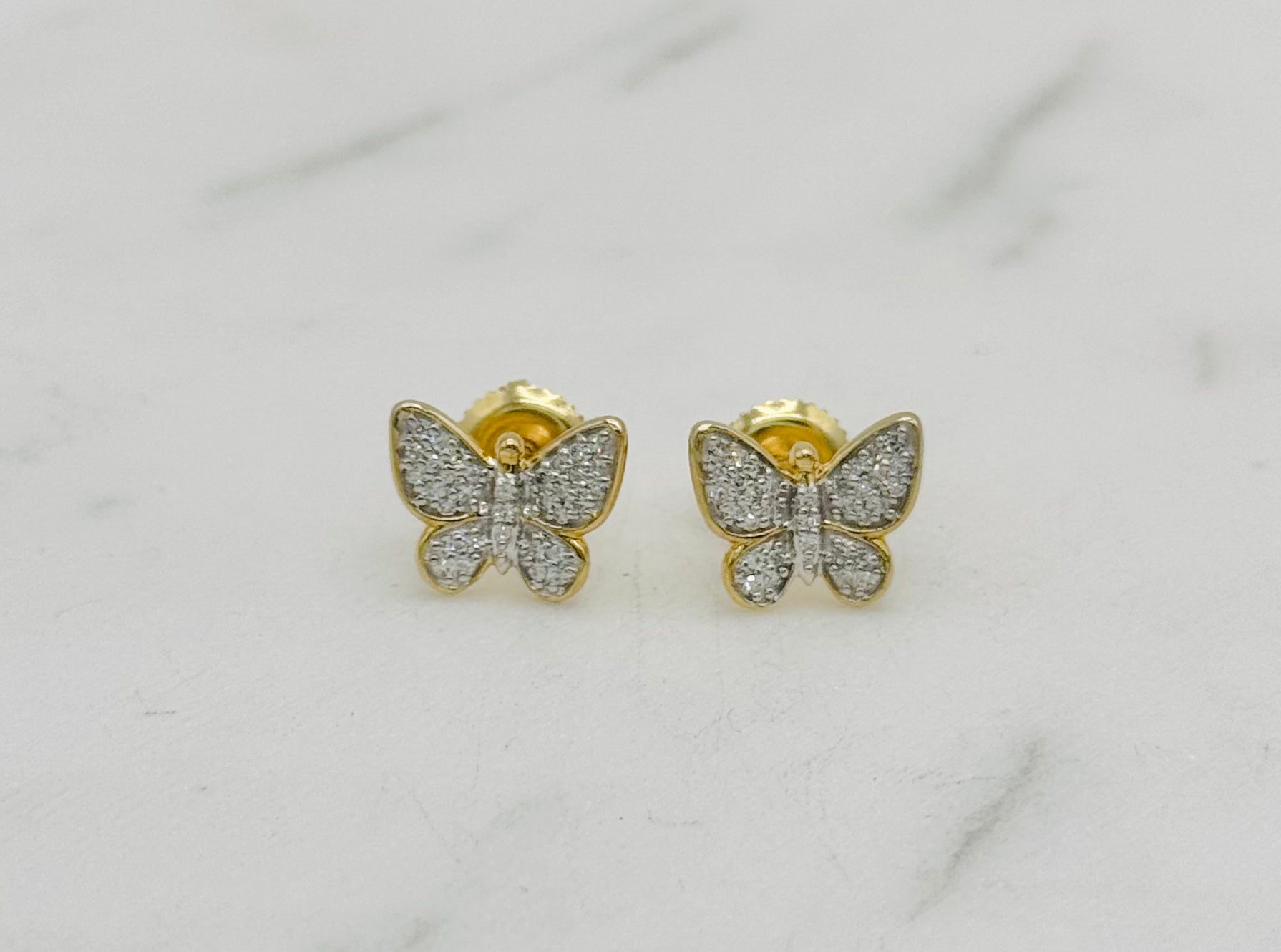10K Yellow Gold 0.10Ct 9.9mm Butterfly Diamond Studs with Threaded Stem and Screw Backs.