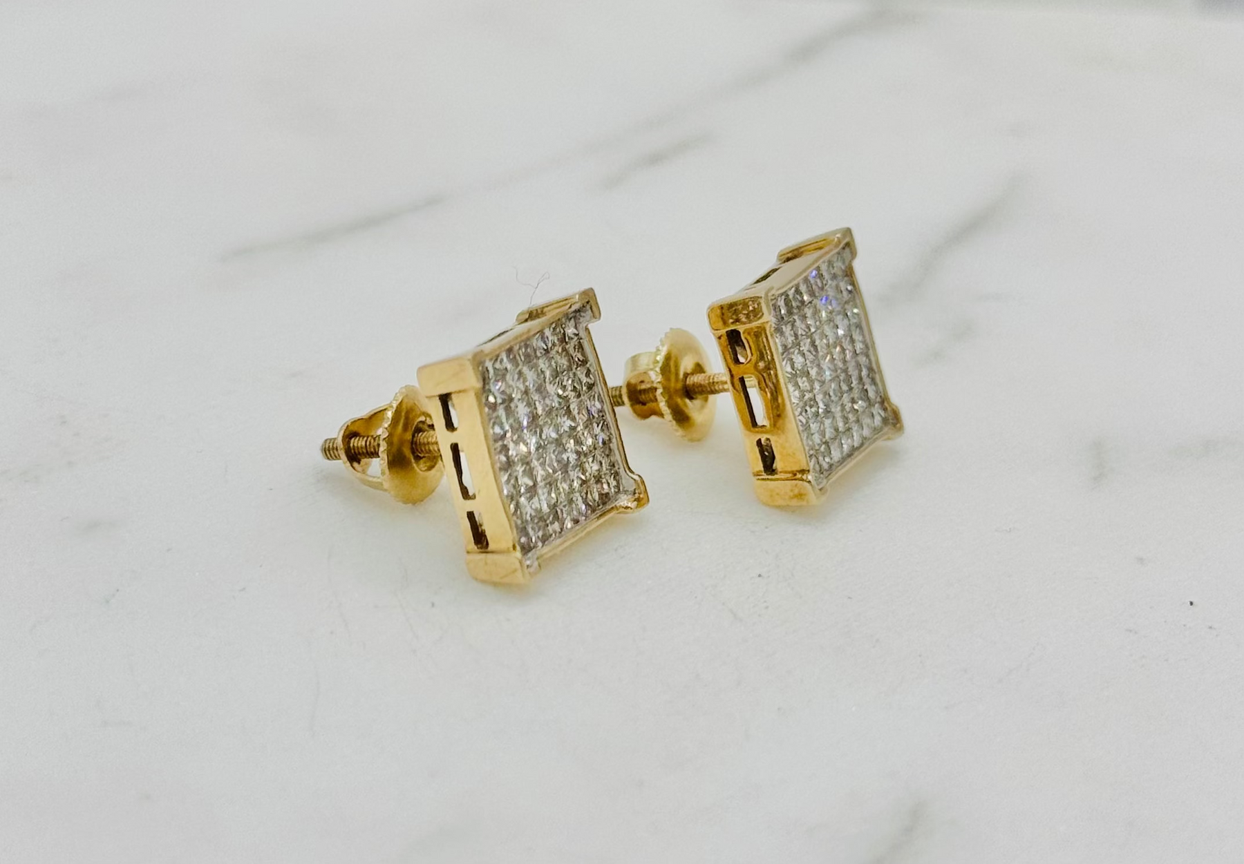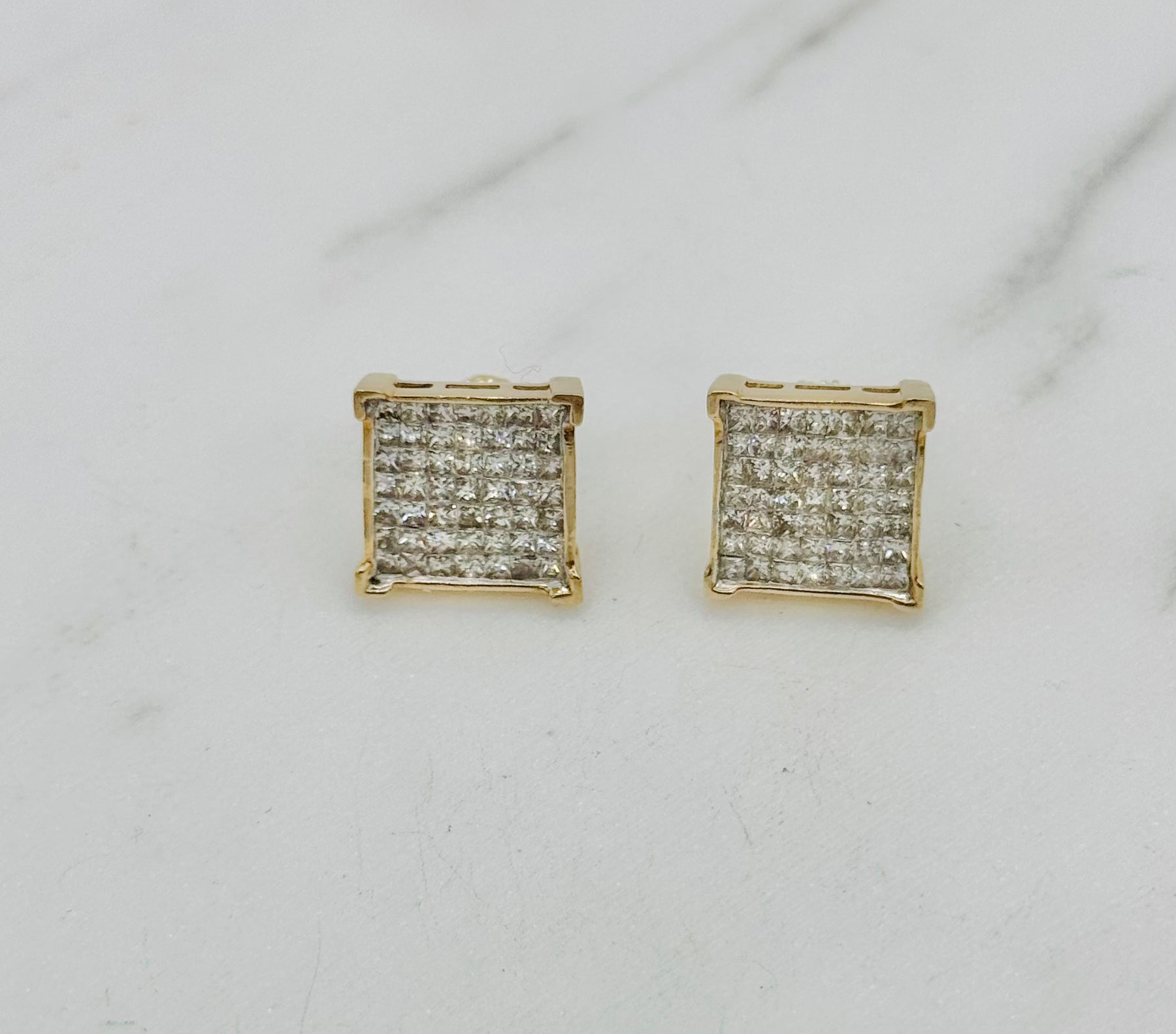 14K Yellow Gold 2.00Ct 11.1mm Square Diamond Studs with Threaded Stem and Screw Backs.