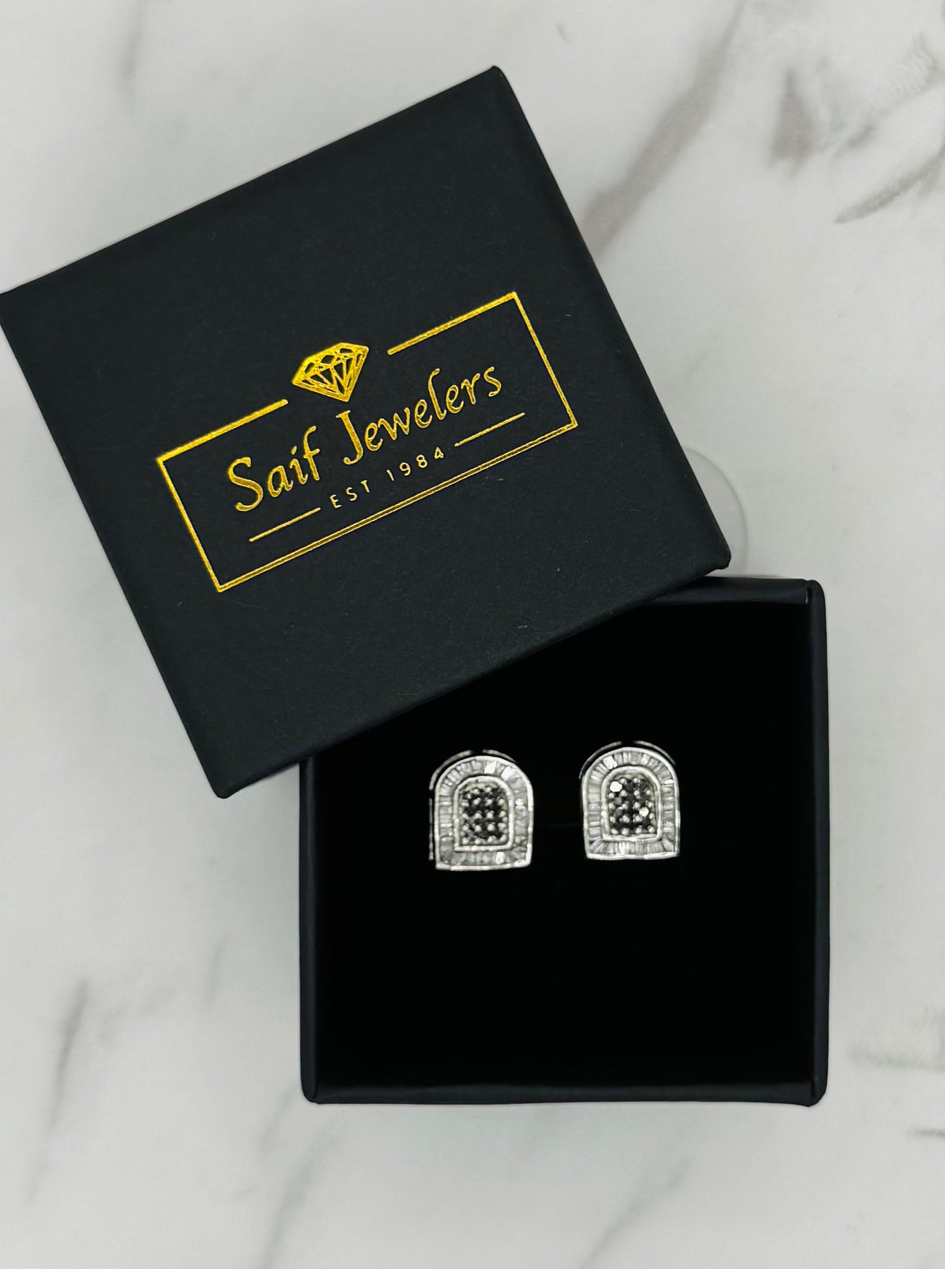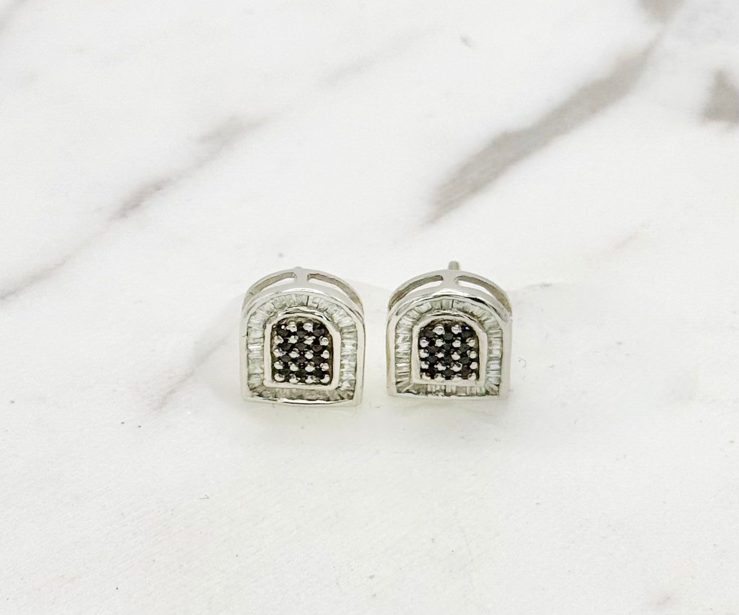 10K White Gold 0.50Ct 9.6mm Black Round Center with Surrounding White Baguettes Diamond Studs with Threaded Stem and Screw Backs.