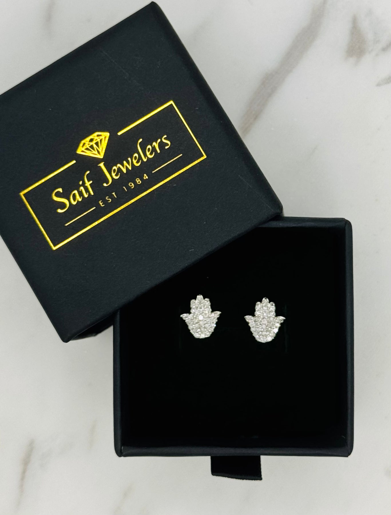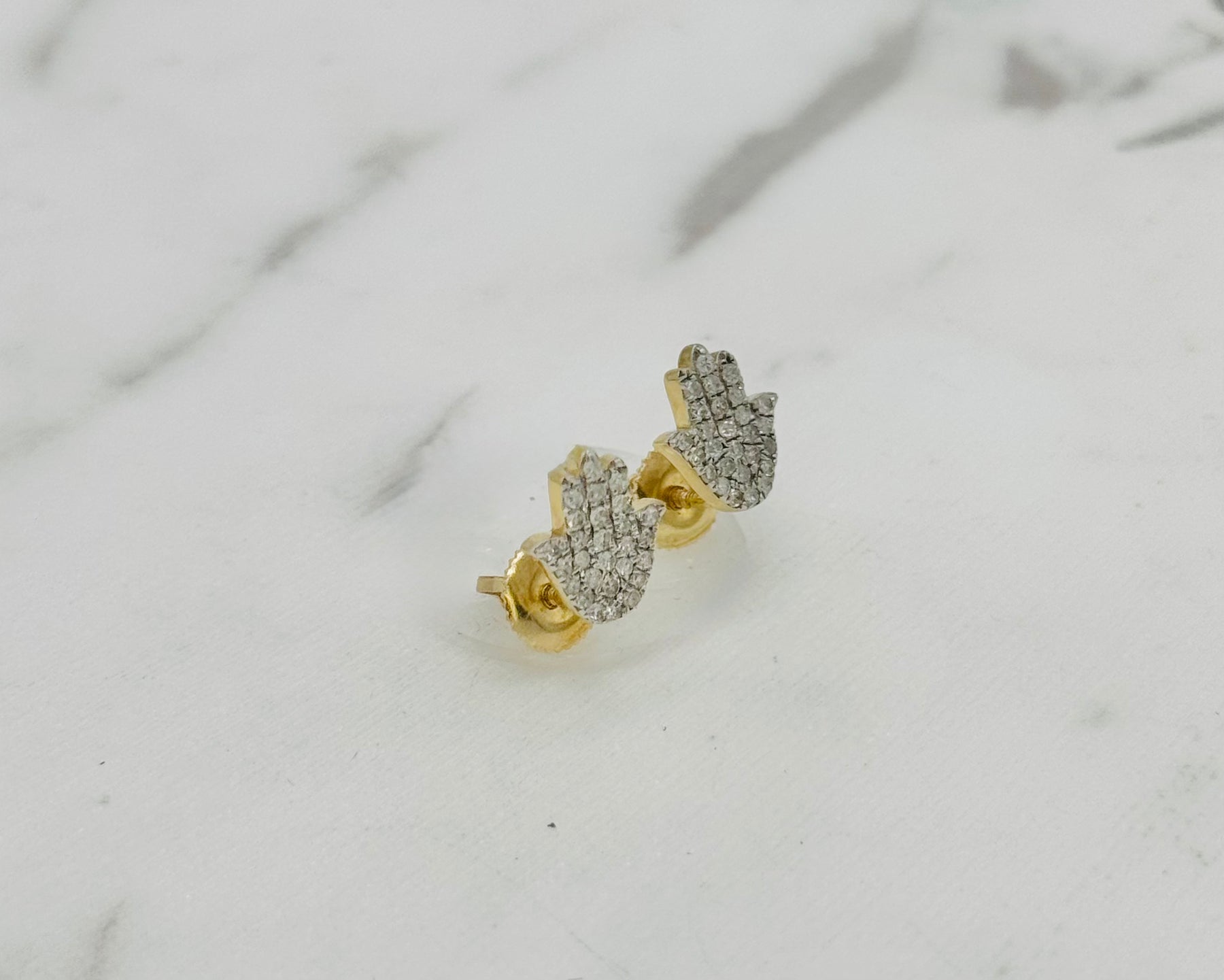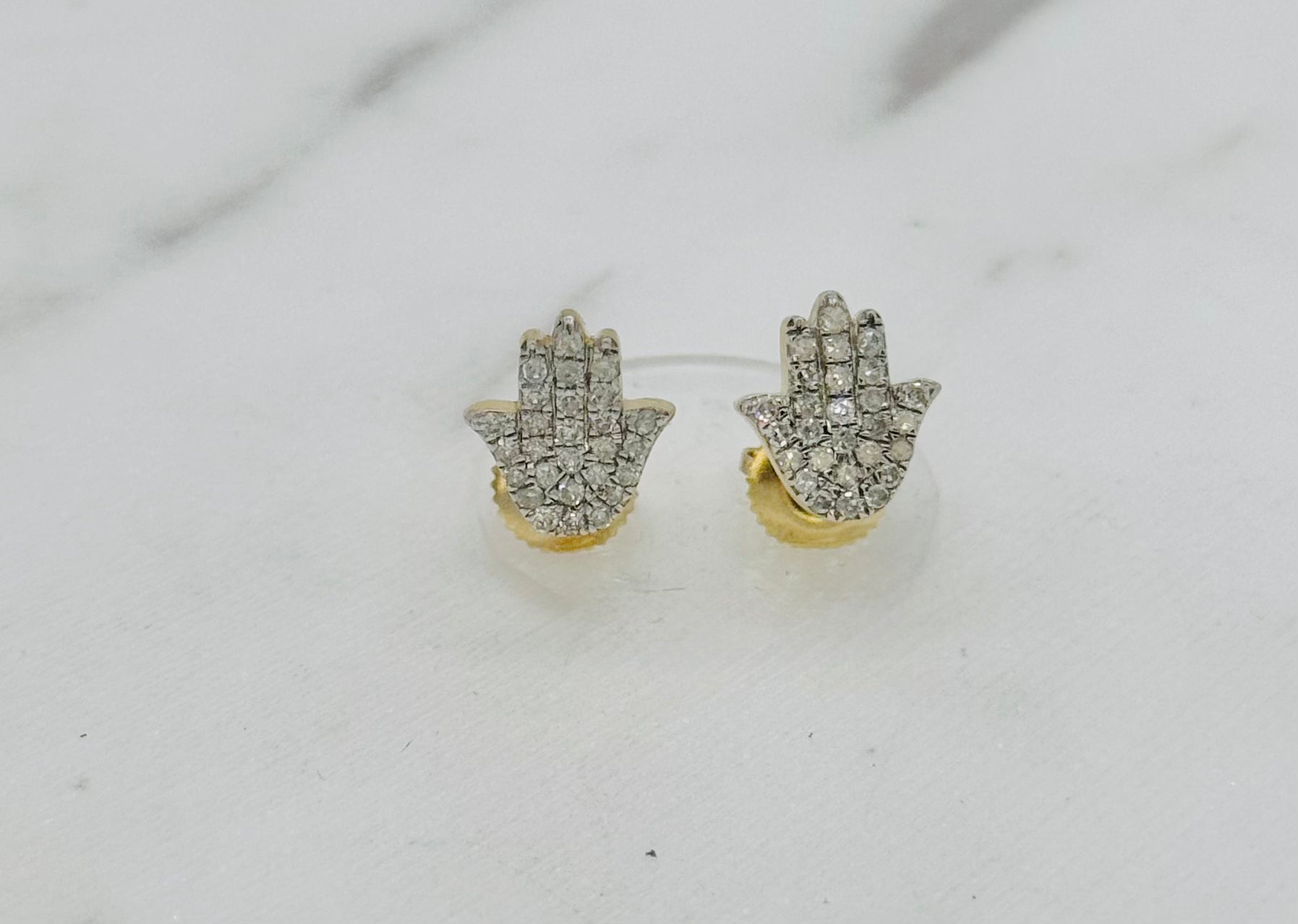 10K Yellow Gold 0.30Ct 8.6mm Hamsa Hand Diamond Studs with Threaded Stem and Screw Backs.