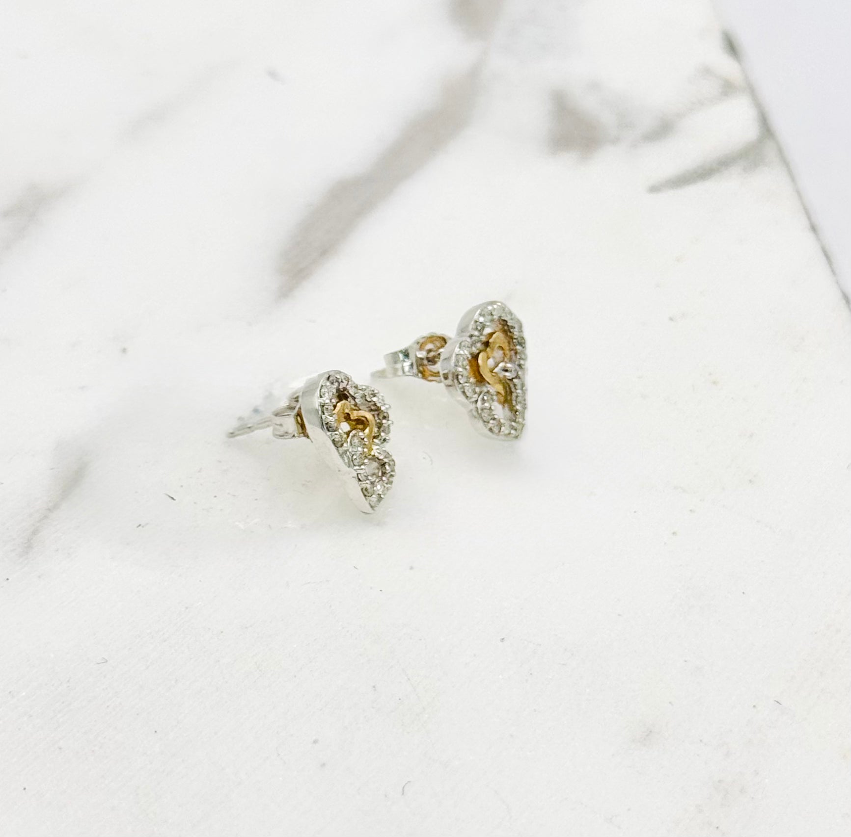 14K White Gold with Yellow Gold 0.25Ct 8.6mm by 7.8mm Triple Heart Diamond Studs with Threaded Stem and Screw Backs.