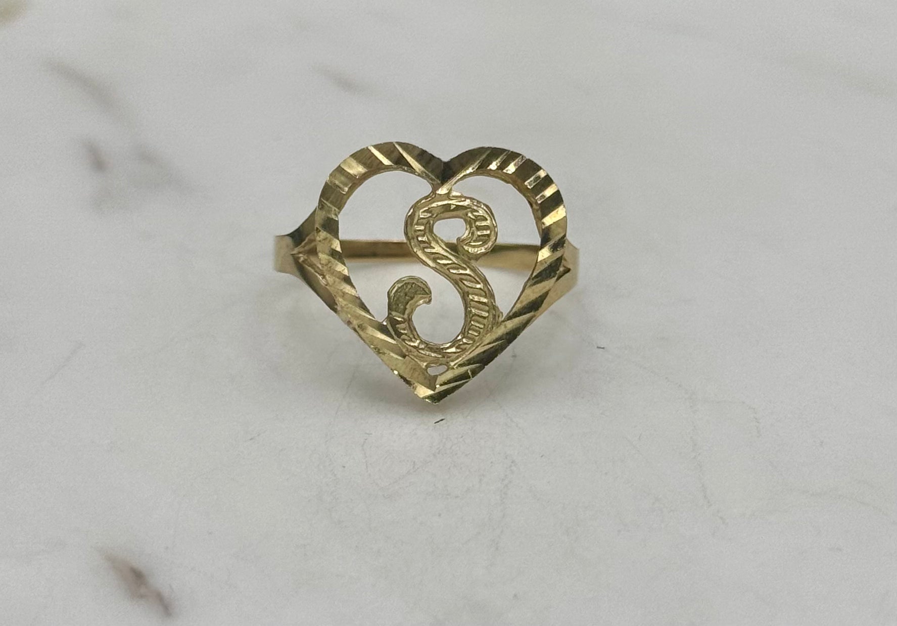 10K Yellow Gold Heart Shape S initial Dia Cut Ring in small and large sizes available. This Ring size is 8.5