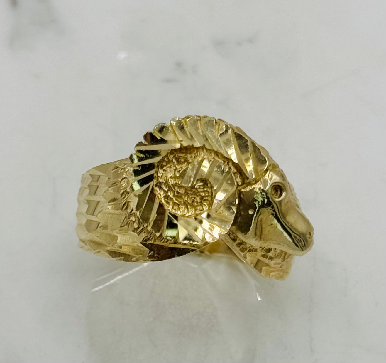 10K Yellow Gold Ram’s Head nugget cut dia cut Ring in small and large sizes available. This Ring size is 10
