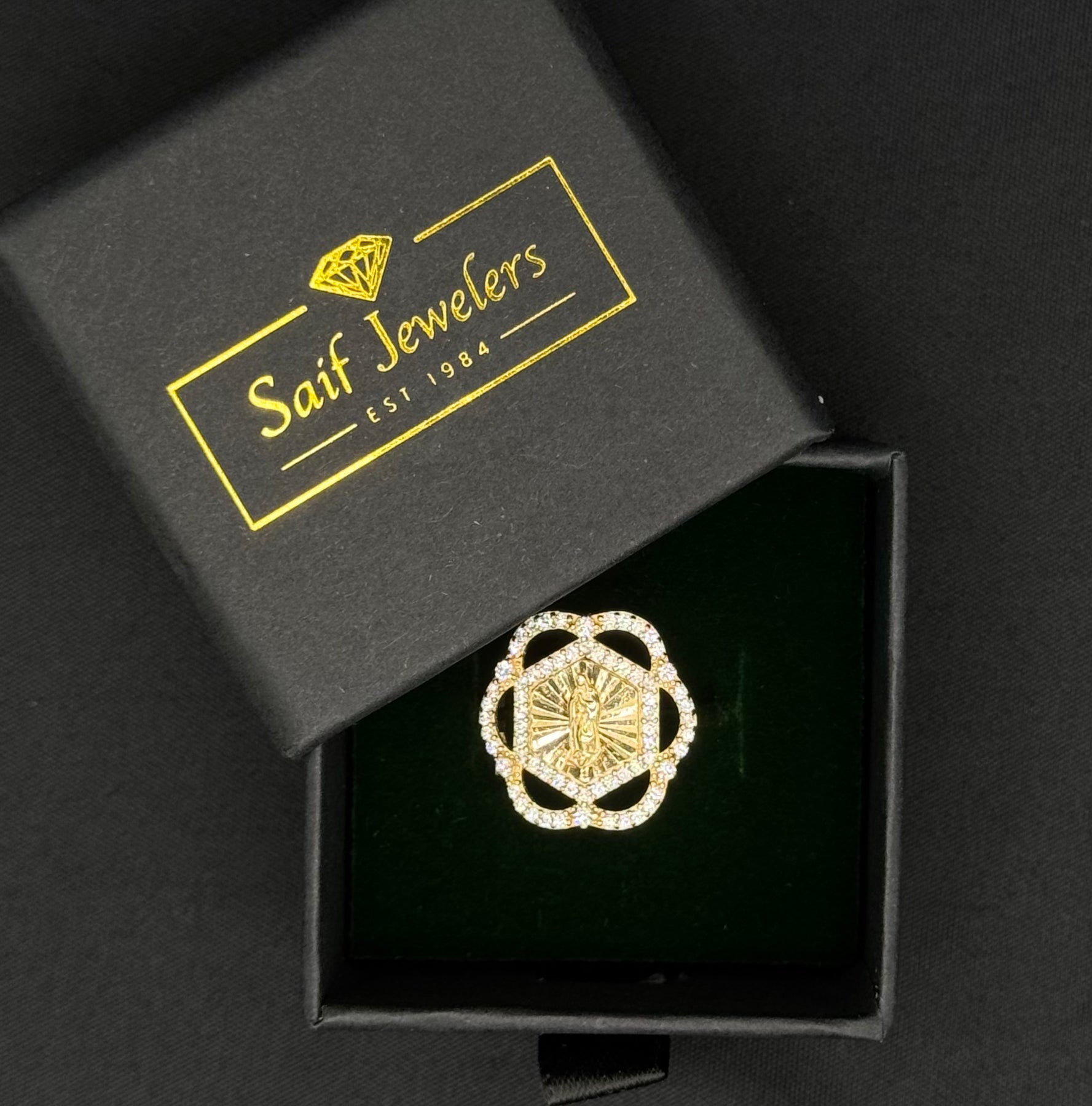 10K Yellow Virgin Mary with CZ Ring in small and large sizes available. This Ring size is 7.5